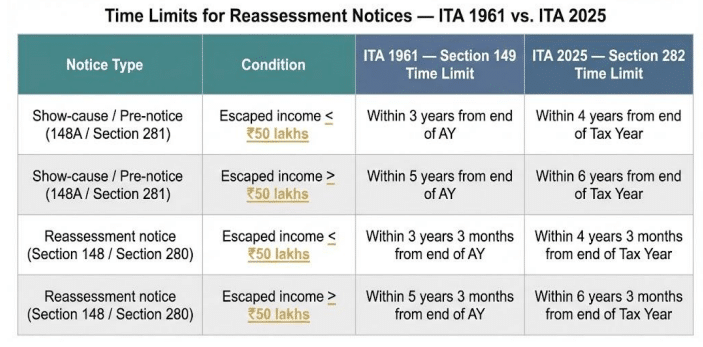 Ans. The reassessment provisions of the Income-tax Act, 2025 (Sections 279–286) will apply to Tax Year 2026-27 and subsequent tax years. For any tax year beginning before 1st April, 2026, only the old Act provisions will apply for reassessment.