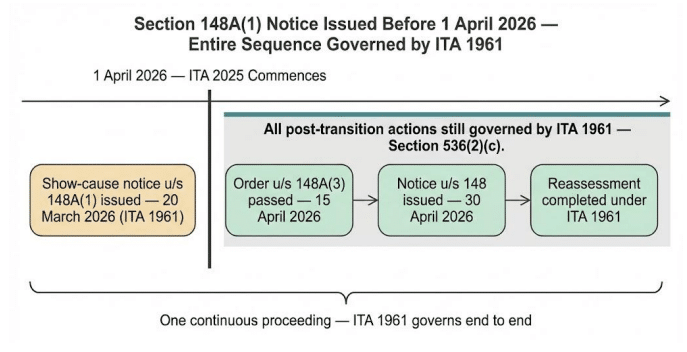 Ans. Yes. Section 536(2)(c) of the Income-tax Act, 2025 expressly provides that the provisions of the repealed Act shall continue to apply to any proceeding pending on the date of commencement of the new Act. Since the proceedings were initiated under the Income-tax Act, 1961 through issuance of a notice under section 148A (1), the entire sequence of consequential actions — including the order under section 148A (3) and notice under section 148 — shall be governed by the provisions of the 1961 Act. However, such continuation is subject to compliance with the limitation period prescribed under section 149 of the Income Tax Act, 1961. Example: The AO issued a show cause notice under Section 148A(1) to a taxpayer for AY 2022-23 on 20th March, 2026. After considering his response, the AO passes an order under Section 148A (3) on 15th April, 2026 and issues the notice under section 148 of the old Act on 30th April, 2026. All these actions are valid even though the new Act commences on 1st April, 2026.