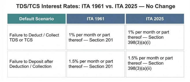 Ans. No. The interest rates applicable for defaults in deducting or depositing TDS/TCS remain unchanged from those prescribed under the old Act. In accordance with Section 398(3)(a) of the Income-tax Act, 2025, interest is calculated as follows: