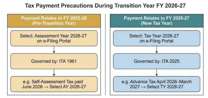Ans: The government is taking appropriate measures to ensure simultaneous functionality for both Acts on the tax filing Portals, during this transition period. However, taxpayers should ensure correct selection of Assessment Year (AY 2026-27) for tax payments relating to FY 2025-26; and correct selection of Tax Year 2026-27 for tax payments relating to FY 2026-27, so that tax credit is granted in correct year.