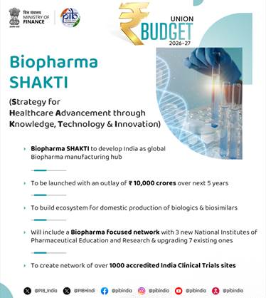 To develop India as a global Biopharma manufacturing hub, the Budget proposes Biopharma SHAKTI with an outlay of ₹ 10,000 crores over the next 5 years. This will build the ecosystem for domestic production of biologics and biosimilars. The Strategy as envisaged in the Budget will include a Biopharma-focused network with 3 new National Institutes of Pharmaceutical Education and Research (NIPER) and upgrading 7 existing ones. It will also create a network of over 1000 accredited India Clinical Trials sites. The Union Budget proposes to strengthen the Central Drugs Standard Control Organisation to meet global standards and approval timeframes through a dedicated scientific review cadre and specialists.
